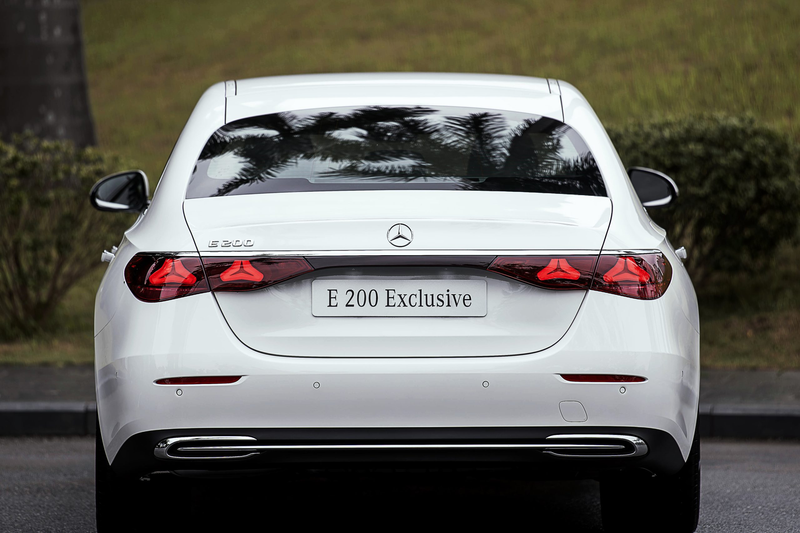 Đuôi xe của Mercedes E200 Exclusive 2025 mang lại sự liền mạch và thanh lịch với cụm đèn hậu LED hình “logo Mercedes-Benz” tinh tế. Thanh chrome sáng bóng kéo dài ngang đuôi xe, kết nối hai bên đèn hậu, làm nổi bật chiều rộng và tạo hiệu ứng ánh sáng ấn tượng khi di chuyển vào ban đêm. Cản sau với ống xả kép đối xứng (tùy chọn) và thiết kế khí động học hoàn thiện vẻ ngoài sang trọng, phù hợp khi dừng tại các địa điểm như khách sạn 5 sao ở Sapa hay nhà hàng cao cấp ở Hà Nội. Đèn hậu LED với hiệu ứng động không chỉ tăng tính thẩm mỹ mà còn nâng cao khả năng nhận diện trên đường.